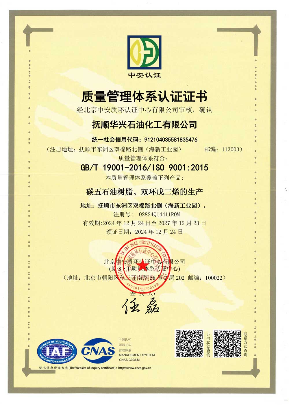質(zhì)量管理體系認(rèn)證證書