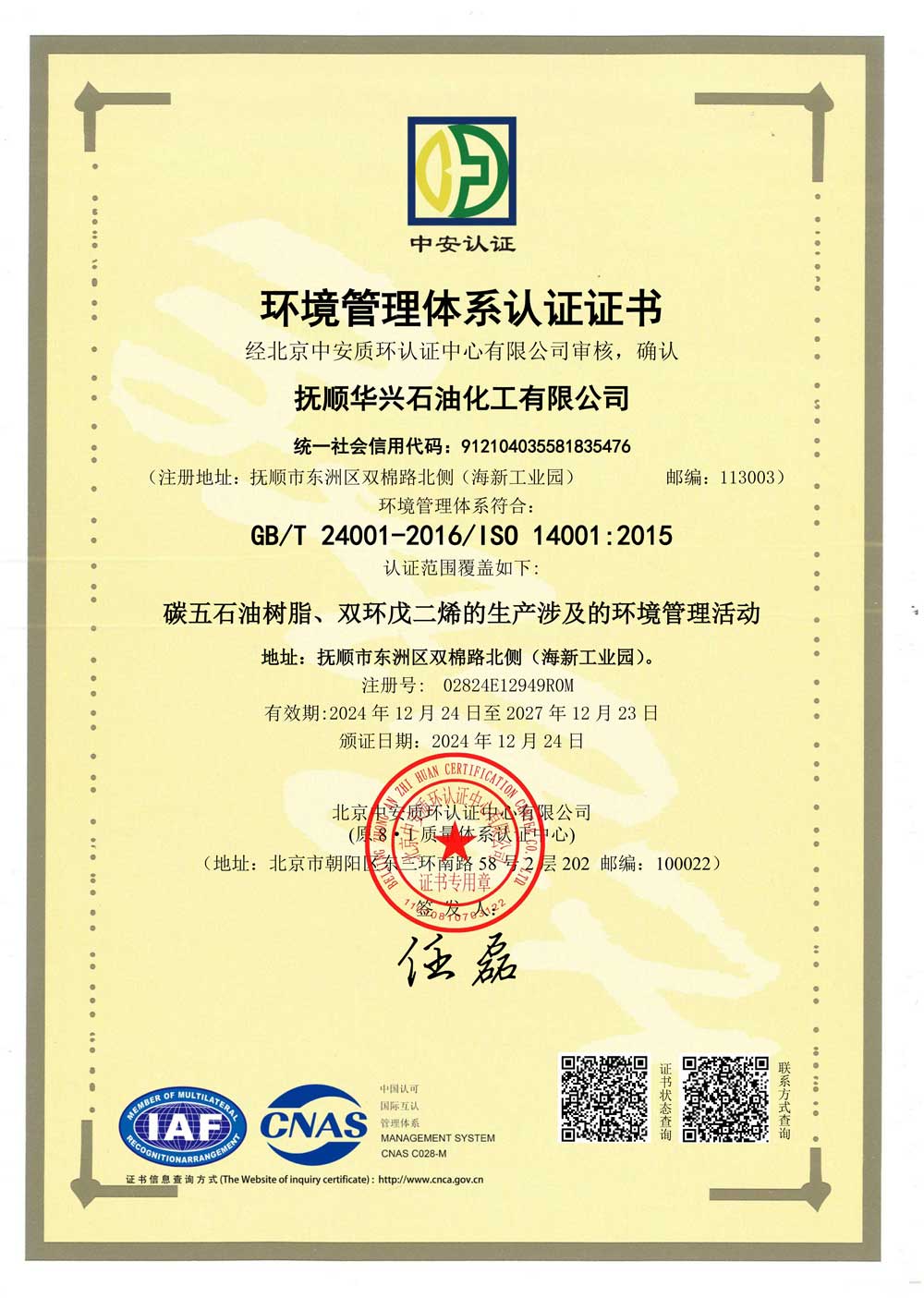 環(huán)境管理體系認(rèn)證證書