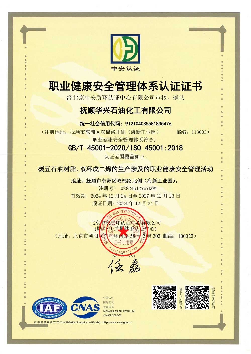 職業(yè)健康安全管理體系認(rèn)證證書